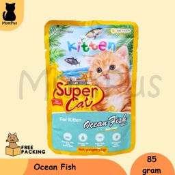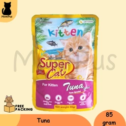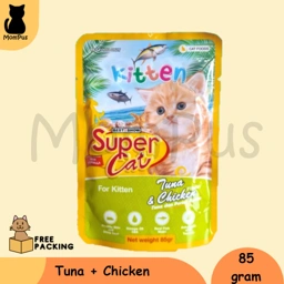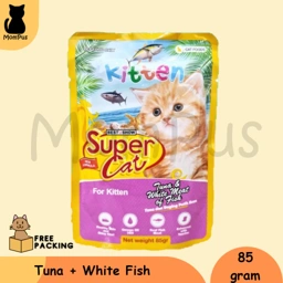 ❤️Super Cat Pouch Sachet KITTEN Snack KUCING 85gr❤️ Varian : 🐱Tuna 🐱Tuna Chicken 🐱Tuna White Fish 🐱Ocean Fish Kandungan : 🐱Protein: min 8.5% 🐱Fat: min 1% 🐱Fiber: maks 1% 🐱Moisture: maks 86%